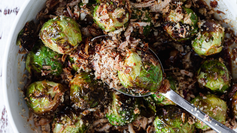 - Top the Brussels sprouts with at least half the sauce, and sprinkle with crispy fried onions. Serve immediately.
