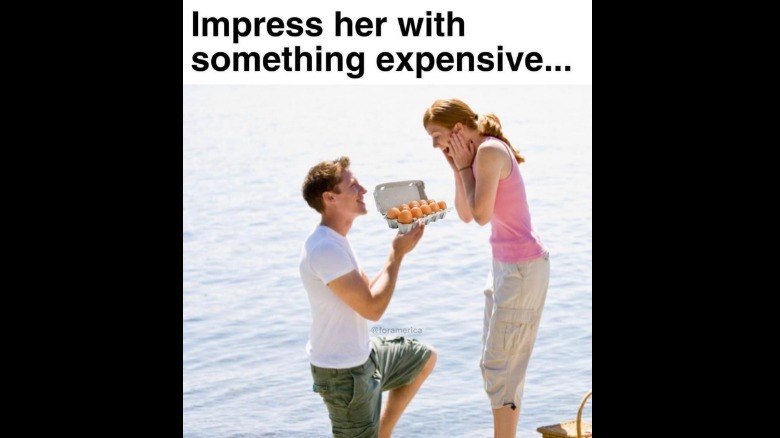 The egg price increase conveniently coincides with the time of year when romantic commercials abound, right in time for Valentine's Day. A number of commentators have turned this to their advantage, making the natural connection between expensive gifts and GIFS. One person on Twitter posted an image of a man on one knee, proposing to his delighted sweetheart. What made her so happy to accept? He had a whole carton of eggs in his hand instead of the clichéd diamond (score!).