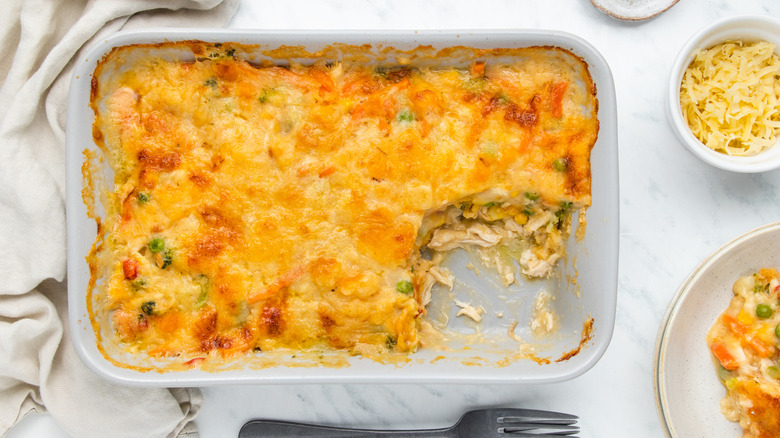Did you ever think that you would hear the words "chicken" and "cobbler" in the same recipe? Yeah, we didn't either. But, low and behold, TikTok has given us yet another viral recipe that is sweeping the internet and making its way to dinner tables across the globe. This recipe has several layers of goodness that make it a complete meal. From the shredded chicken and veggies seasoned with garlic and onion powder to the layer of flaky biscuit and the cheese on top, this recipe truly has it all and there's no need for any sides if you are in a rush. All you need is one baking dish to get started.