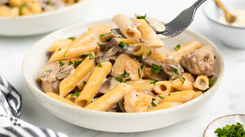 Mashed recipe developer Catherine Brookes created this copycat Cheesecake Factory pasta Da Vinci you'll want to whip up immediately. With simple ingredients and an easy cooking process, you can enjoy the deeply savory flavors of this chicken and mushroom pasta from the comfort of your home. She shares, "I love the deliciously rich and creamy taste of this pasta. The sauce is so silky and packed with flavor!" You may want to serve this winning dish to friends — though they might naturally expect a slice of copycat Cheesecake Factory cheesecake for dessert too!