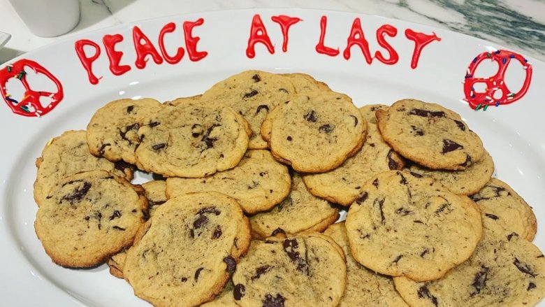While their reconciliation may have kicked off with Perry sending Swift an actual olive branch, then later appearing dressed as a hamburger in Swift's aptly-named "You Need to Calm Down" video, it was yet another food item that evidently sealed the deal on their new friendship. Yes, nothing says "I no longer hate you" like a big plate of freshly-baked chocolate chip cookies (via People).