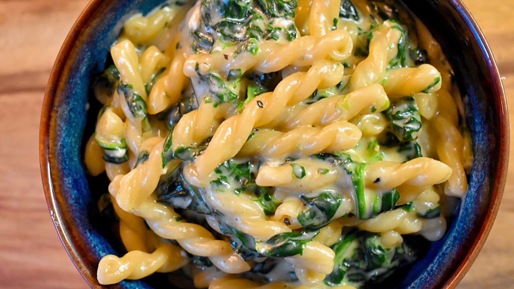 The ingredients list for this one-pot spinach and feta mac and cheese is fairly straightforward. You'll want to start, of course, with your favorite pasta. You can use regular elbow macaroni, but we love the added texture of a slightly longer, twistier pasta like gemelli or cavatappi. Theoretically, though, you could make this with any dried pasta even spaghetti — you'll just need to adjust the cook time accordingly.