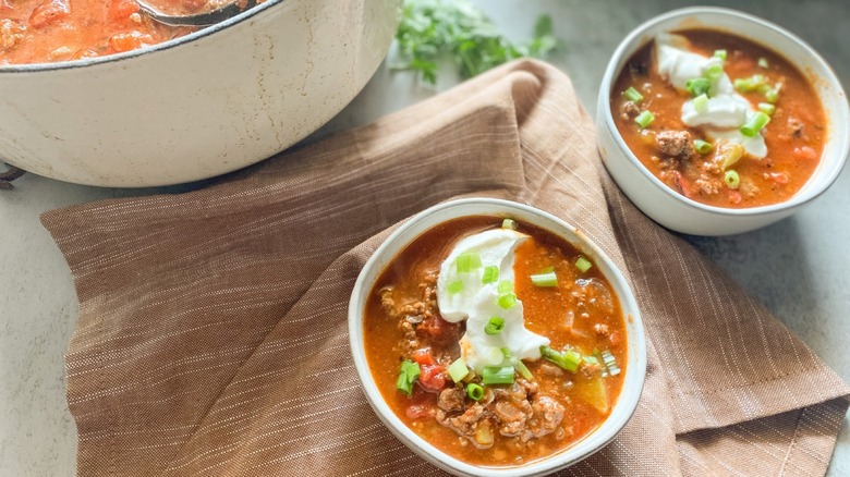 To make this mouthwatering masterpiece, you'll begin with ground beef, salt, pepper, yellow onion, and fresh green bell pepper. Ingredients special to this recipe include chicken broth, fire-roasted tomatoes, canned green chiles, tomato paste, smoked paprika, and cayenne pepper. Lastly, we'll garnish with some diced green onions and sour cream.
