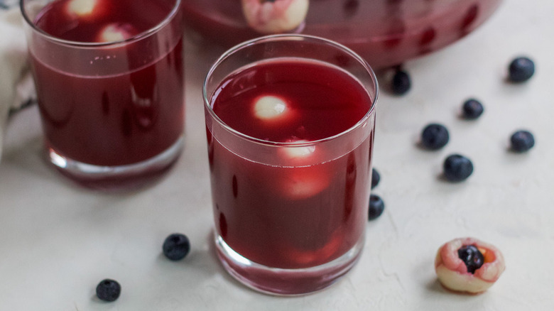 Most of the ingredients for this punch can be found at most any grocery store you can find. Only one ingredient — lychee — may be a bit harder to track down, but even so, it's not too hard to find. "Lychee fruit is a sweet and floral fruit native to Southeast Asia," Shelbert explains, adding that "canned lychee is easily found in the Asian section of major grocers stores or in Asian markets." So, you'll need a can of lychee and its juice, some blueberries, pulp-free orange juice, cranberry juice, pomegranate juice, and some ginger ale to add some fizz.