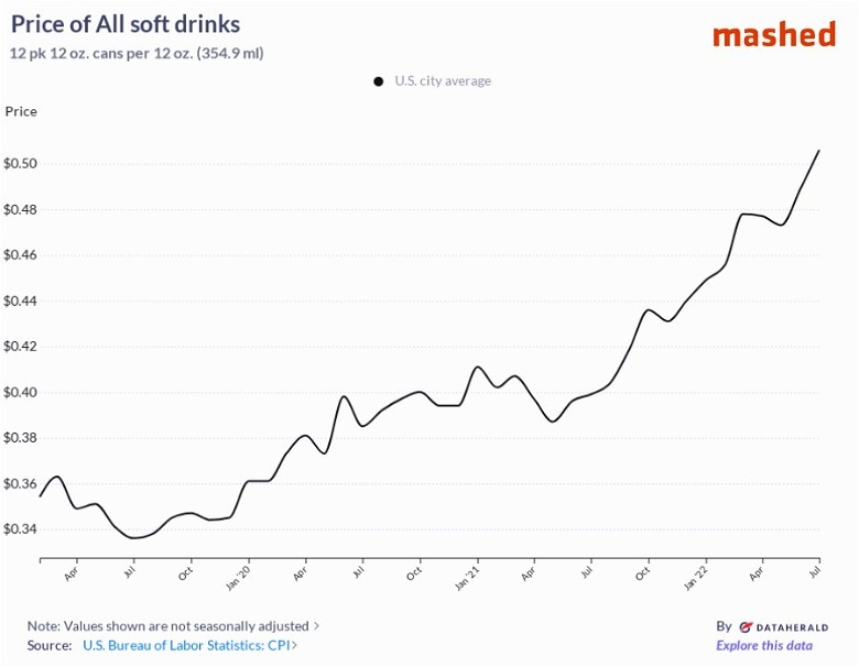 Many people might consider their morning brew necessary despite the cost of coffee beans rising an astonishing 38.8% over the last three years. Its also true that most consumers will splurge when it comes to their weekend beer: Even if their go-to selection is now too expensive, people will willingly "[trade] down for cheaper beer brands" (via The Wall Street Journal). With the prices rising for your beloved coffee and spirits, soft drinks are also taking a hit amidst the record-high inflation of 2022.
