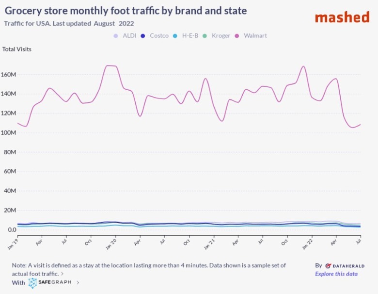 According to SafeGraph data that shows foot traffic at five major U.S. grocery retailers from January 2019 to August 2022, Walmart has consistently brought in the most customers on average. The chain welcomed over 108 million shoppers in July 2022 alone, while H-E-B brought in just over 25 million, Costco around 34 million, Aldi around 63 million, and Kroger around 46 million that same month.