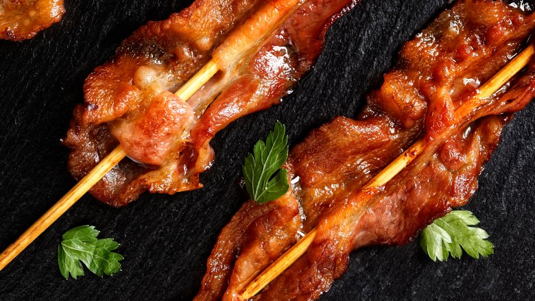 Thread bacon slices onto a skewer like a ribbon, then brush both sides with maple syrup. Put the skewers on a baking sheet topped with a wire rack, then bake at 425 degrees for about 20 minutes, turning once. The result is sweet and salty heaven.