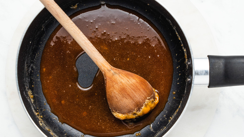 - Add the sugar to a saucepan and place it over medium heat. Stir frequently until the sugar is dissolved and golden brown, about 8 to 10 minutes.