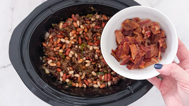 Once your timer goes off, add the remaining bacon to the top of the ingredients in the slow cooker. Then you can scoop and serve into a bowl or cup. This recipe is great as a side or a main dish. "I like to top mine with some green onions and crumbled tortilla chips, but any chili toppings would work," Johnson says.