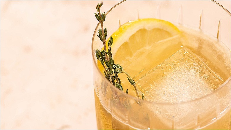 - Strain over ice into a rocks glass. Garnish with lemon and thyme.