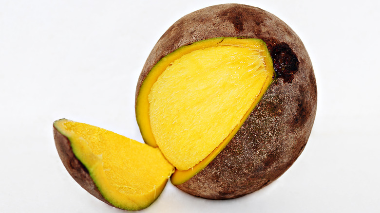 With thick brown skin and a funky smell similar to that of a durian, bambangan mangoes can be the size of a bowling ball and weigh as much as 5 pounds. Even more peculiar, however, is the mango's taste. Not only is bambangan far from sweet, but Atlas Obscura describes it to have "a savoriness reminiscent of French onion soup and eggs hovering over a base of sourness." YouTuber Jared Rydelek, who documents various species of fruits on his channel, rates bambangan a six on a scale of "zero to lemon" in terms of sourness. That also explains why, unlike most varieties of mango that have sweet applications, bambangan is mostly used in salads and chutneys or is turned into a pickle. Curious? Anyone wanting to taste the rare savory mango for themselves will have to make a trip to the island of Borneo.