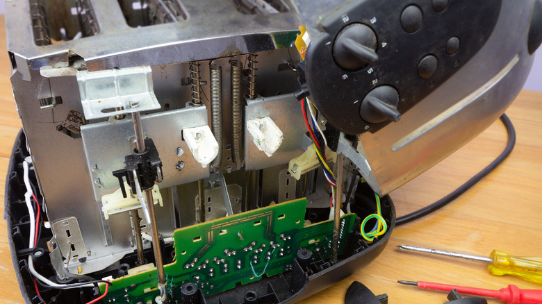 For the casual cook, the numbers on the toaster dial might understandably appear to be a countdown clock. Set the dial at 6, say, and six minutes later, up pops your perfect toast. Though some toasters do use a timer, it's far more likely that the dial on your appliance controls some electrical thingamajigs — a variable resistor, a capacitor, and an electromagnet. Together, they do comprise a timer, but not in the traditional sense.