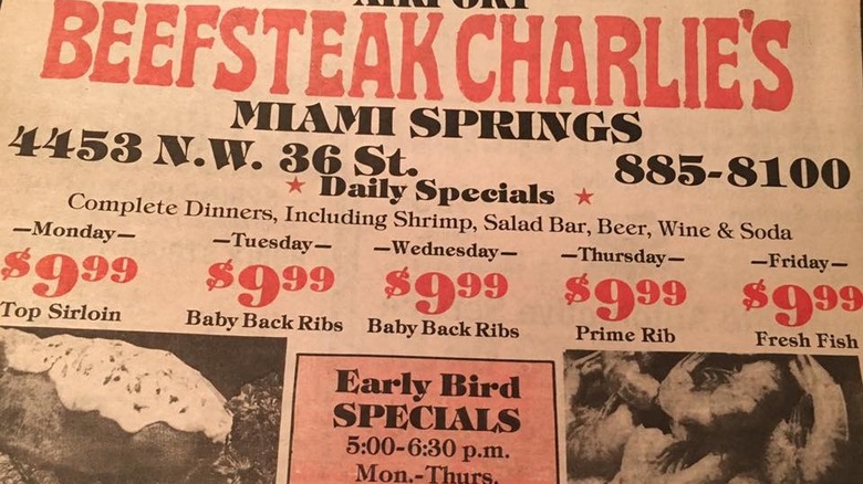 Mr. Steak first opened in 1962 and quickly became a nationwide success. At one point, there were well over 200 locations across the United States, with television ads aplenty (via WFMK 99.1). The chain eventually suffered the same fate as the other steakhouses mentioned thus far –- dwindling sales and unhappy customers that were not too fond of the menu switching over to more salads and fish (we don't know about you, but when in Rome, one orders a steak, not a salad).