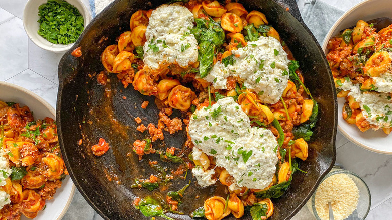 One of the hardest parts about cooking a lasagna is trying to work with those floppy noodles – or, indeed, to get them out of the cooking water without tearing them. This lasagna, however, makes use of no-cook noodles to make for easier layering. It also uses store-bought sauce, and if you want to hit the shortcut trifecta, you can even go with pre-shredded mozzarella instead of shredding your own. (As Paris Hilton shares in the inaugural episode of her cooking show, box graters are just "so brutal.") Once you've gone through the hassle of cooking the lasagna, however, you can portion it out in single-size freezer containers and just zap it back to life the next time you get hungry.