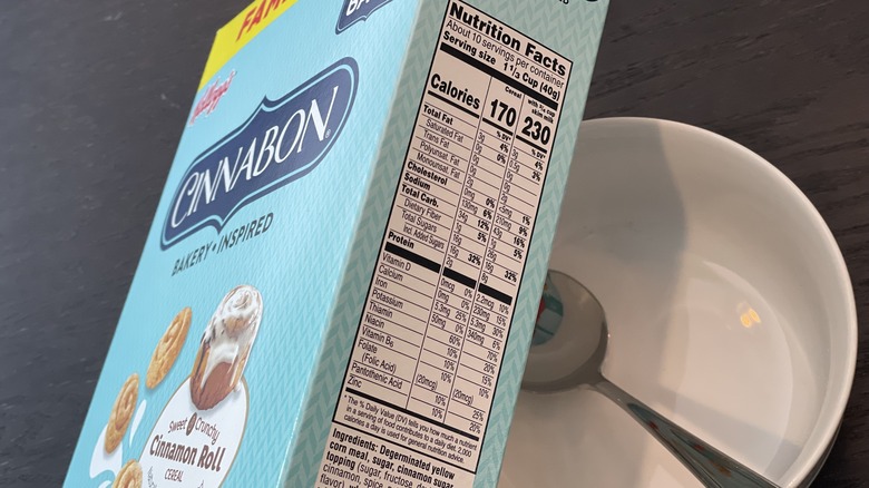 Remember how we said that this breakfast cereal from Kellogg's was inspired by a cinnamon roll from Cinnabon that has 880 calories, 59 grams of added sugar, 37 grams of fat, and 16 grams of saturated fat? Right, those stats. Well, this cereal isn't what anyone not in lobbying or PR could call nutritious with a straight face (or a clean conscience) either. On the side of the box, you'll find nutrition information for a 40-gram serving of the cereal dry as well as when served with three-quarters of a cup of skim milk, but for our purposes, we're sticking with the dry serving as the reference.