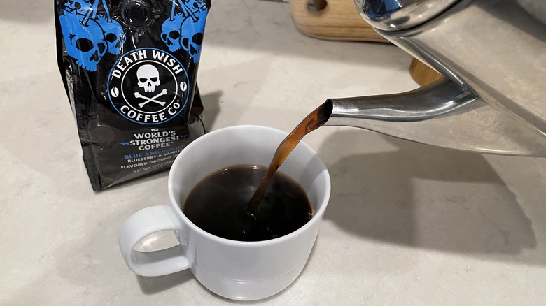 In one way — arguably the most important way — this limited-release coffee from Death Wish Coffee is just like all the other coffees the company offers: the caffeine. In just one ounce of properly brewed Death Wish Coffee (the company recommends you use two and a half tablespoons of ground coffee per six ounces of water) you'll find 59 milligrams of caffeine. So, in a six-ounce cup of coffee, you'll find up to 350 milligrams of caffeine. For comparison, a standard eight-ounce cup of coffee from other brands has about 95 milligrams of caffeine per cup (via Healthline). So yeah, this brand is strong across all its flavors.