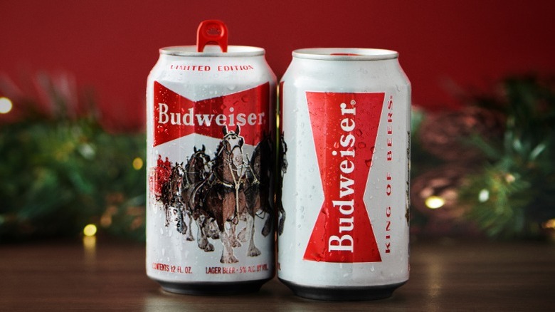 Budweiser's new can design embodies the holiday spirit while keeping true to the brand it's created by. Instead of rolling out multiple designs like in the previous year, the beer titans kept it simple with just one variation. Per a press release sent to Mashed, the can features the Budweiser Clydesdales as well as red and white holiday colors. The Budweiser logo is imprinted in the vintage bowtie form "as a reminder that Budweiser has been part of special holiday memories with friends and family for decades."