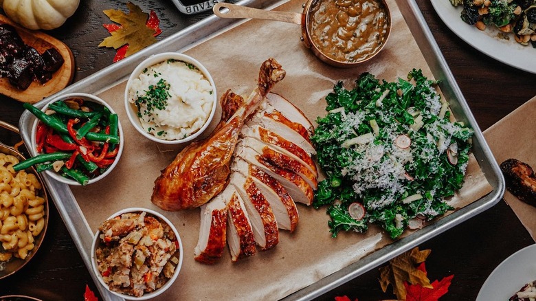 Although you can't dine in the elegant and rustic dining room of Oak and Reel on Thanksgiving itself, the restaurant's at-home feast will still capture the magic of Oak and Reel's kitchen. This year, its slow-roasted turkey is accompanied by oyster stuffing, roasted Brussels sprouts with cippolini onions and pancetta, mashed potatoes, gravy, cranberry sauce, and dinner rolls. Depending on the size of your crowd, both half-turkeys and whole turkeys are available. Finally, a seasonal pumpkin Basque cheesecake and chocolate tart will guild the Thanksgiving lily (via Tock). For you, reheating the goods according to the chef's instructions will be the hardest part.