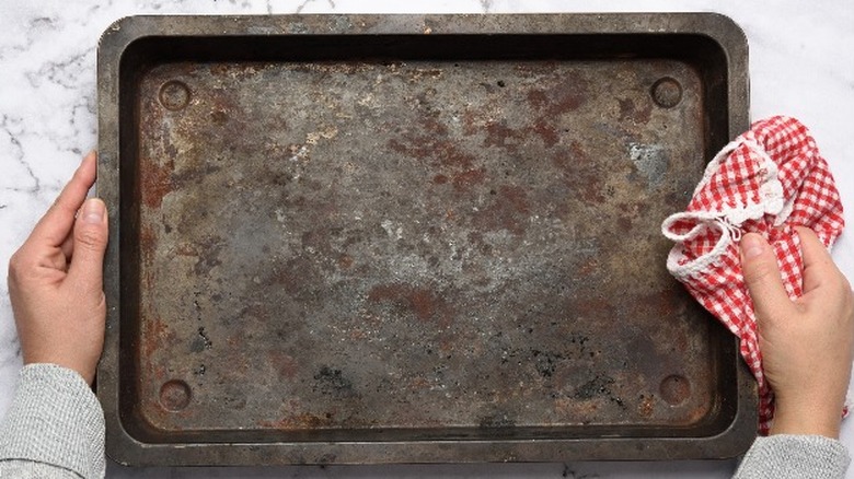 And, there are ways to avoid a warping situation. First of all, if you're relying on your dishwasher for cleaning, you could be ruining your baking sheets. The dishwasher does a number on baking pans, from bending them to discoloring them. You'll also want to avoid transferring sheet pans directly from the refrigerator to the oven. Rapid temperature change is a catalyst for that loud popping sound. Finally, per Checkered Chef, use a heavy metal pan that has rolled edges and is made of aluminum, which is less likely to warp than other materials.