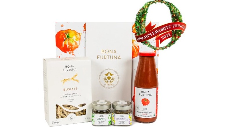 The organic artisanal set comes with Ancient Grain Busiate Pasta, Bona Fortuna Marinara Sauce, a sea salt and herb blend, and a jar of dried basil. The pasta has a "touch of sweetness, herbal hints, sunkissed grain, and accents of cinnamon."