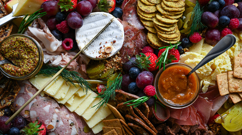 Start by putting down a cloth to go under your food and creating a space on the table for your masterpiece. This might include a few sprigs of festive foliage and raised boards to add some different heights. At various places around the area, lay out slices of bread and cascades of crackers. Add bowls of olives and bunches of red and green grapes. Your cheeses are added next. Slice or cube the cheese so it's easy for guests to grab a bite-sized piece. Fill any empty spaces on the table with layers of charcuterie, as well as dry additions like nuts and pretzels, small pieces of fruit like strawberries, and garnishes. Don't forget to Instagram your glamorous grazing efforts before guests dig in!