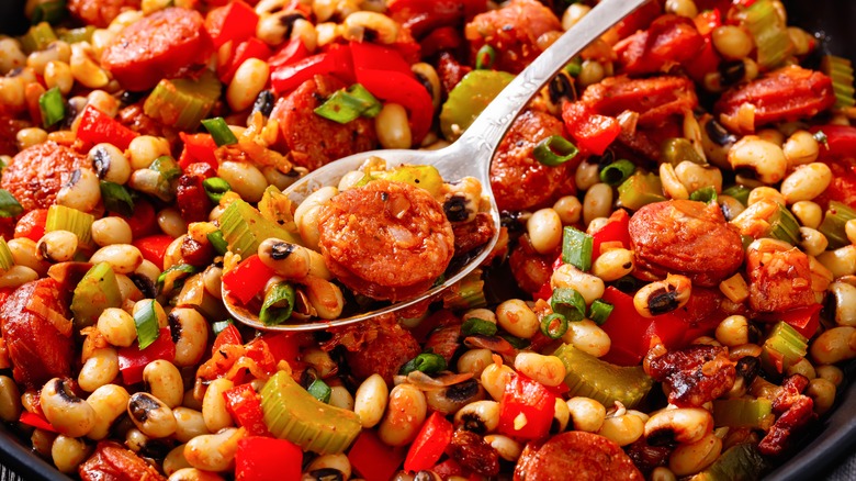 The recipe made its debut in an 1847 book titled "The Carolina Housewife," but History.com reports that enslaved people were making the dish long before it was published. The standard recipe includes black-eyed peas, cornbread, collard greens, tomatoes, and pork of some sort. The main lucky ingredient, black-eyed peas, is a bean that was introduced in American cuisine by enslaved West Africans, and it symbolizes wealth, hope, and luck in the New Year. Cornbread and collard greens also represent gold and money, respectively, while the pork serves as a symbolic reference to the low-quality meats fed to enslaved Africans, and tomatoes are a symbol of health.