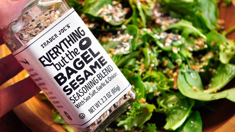 Trader Joe's eclectic and fun offerings don't stop in the frozen aisle. They also offer unique, mouth-watering blends at great prices. Everything but the Bagel is a smash hit meant to replicate the flavors and seasonings found on an everything bagel, like ground garlic and onion, as well as poppy seeds and sesame seeds. A 2.3-ounce bottle currently clocks in at just $1.99, which makes it surprisingly economical considering that sesame seeds alone can cost at least that much. This blend can be added to everything, from salad dressing to creamy dips. Other popular blends include Green Goddess, Mushroom Umami, and Everything but the Elote. TJs even has a pickle-flavored seasoning.