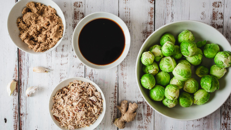The preparation for this recipe is very easy, and we recommend getting all your ingredients set up in advance. For the dish itself, you will also need Brussels sprouts, and crispy fried onions or fried shallots. To make the sauce that coats the Brussels sprouts, you will need brown sugar, soy sauce, ginger, and a garlic clove.