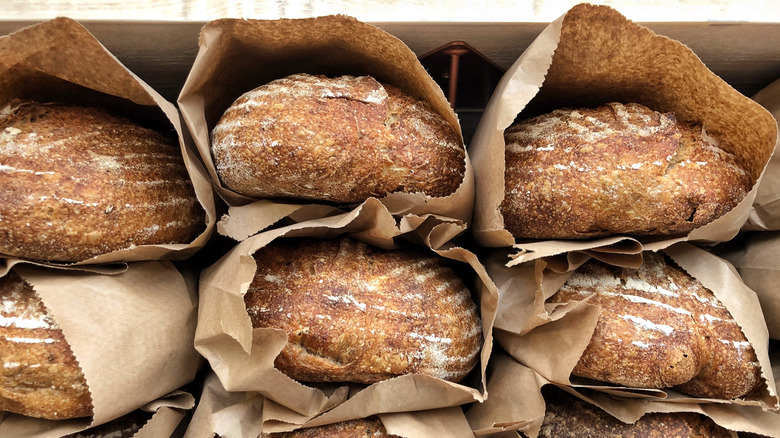 Since fresh bread is best eaten within a few days of baking, it's placed in brown paper bags to allow more airflow, according to Mental Floss. This airflow would not happen if it were condemned to a plastic bag, as air is trapped and moisture is kept in place. However, this does contribute to sandwich bread's overall fluffy texture. Sometimes, paper bags are dotted with tiny holes to encourage more airflow, giving fresh bread a nice crust without drying it out.