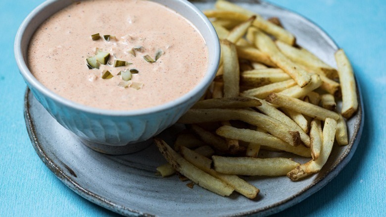 Remoulade sauce is quite similar to tartar sauce in that it is generally made from mayonnaise mixed with chopped pickles. This particular recipe contains both of these all-important ingredients, but also adds some lemon juice, dijon mustard, Creole seasoning, and horseradish. There's one more ingredient that really makes this remoulade stand out: a spoonful of smoked paprika. While this smoky sauce makes a fine dip for raw vegetables, it's even better when served alongside french fries.