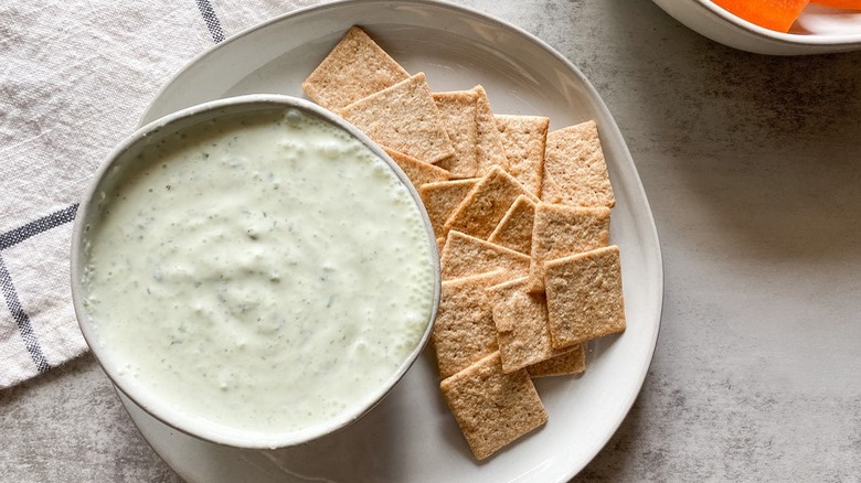 In the beginning, there was a simple onion dip made from nothing more than sour cream and packaged onion soup mix. While this was a staple of mid-century cocktail parties, it fell out of favor over time. This onion dip is not a retread of that retro classic as it swaps that soup mix for onion powder, garlic, and dried parsley. The sour cream is mixed with mayonnaise for a richer texture, while snipped fresh dill brings a whole new flavor to the snack table. In a nod to onion dips of yore, however, we'd still serve this one with ridged potato chips.