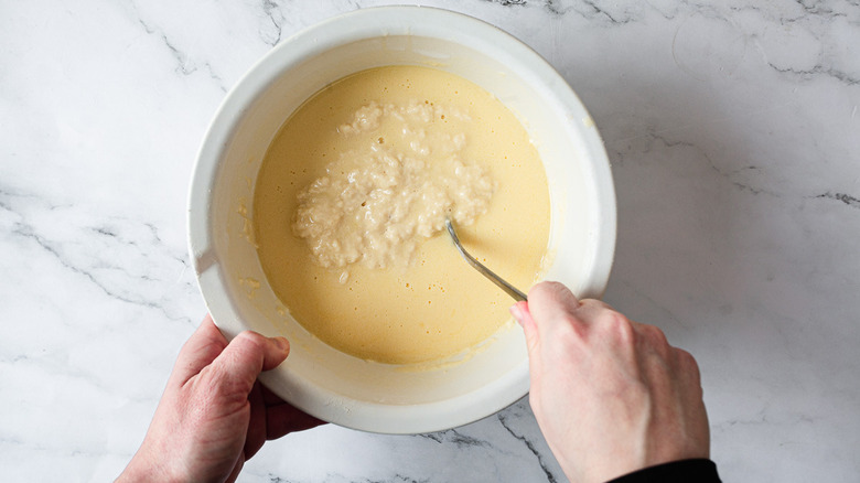 - In a large bowl, whisk the eggs, buttermilk, butter, and vanilla extract together.