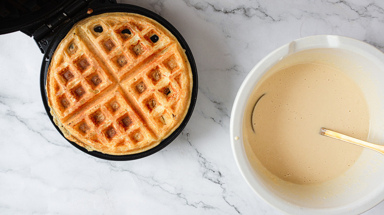 Spray the waffle iron with non-stick cooking spray. It's best to do this before preheating the waffle iron to allow the oil to warm up with the waffle iron. Adding about ¼ to ⅓ cup of batter at a time, cook the waffles according your waffle maker's instructions, until the batter runs out.