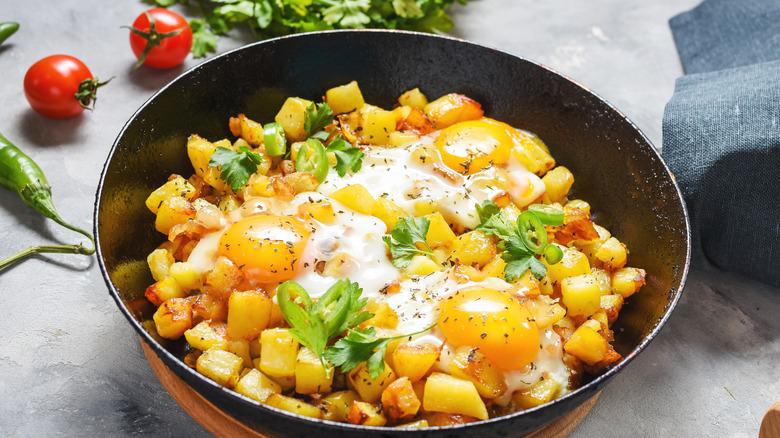 Most casseroles are practically begging for an egg or two — and not just those of the breakfast variety. A perfect case study of this concept is the iconic Jewish noodle kugel dish, which can easily exceed half a dozen eggs in its construction. Though that might seem egg-sessive (sorry, we've been fighting back egg puns this whole article), the kugel maestros among us are onto something: the inclusion of so many eggs enriches, binds, and brings a soufflé-like loft to the often sweet, sometimes savory baked noodle dish.