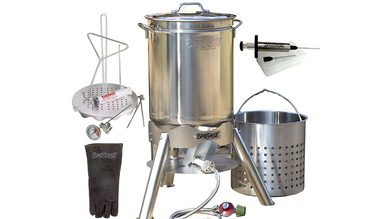 The Creole Feast turkey fryer has done well with Amazon shoppers, receiving an average of 4.7 out of 5 stars. Perhaps one customer sums up the gadget best, saying, "We did our Thanksgiving turkey in this and it turned out great! After using electric 'indoor' fryers for the past few years, it was nice to go back to old school gas frying. I was impressed with all of the extra items that it came with."
