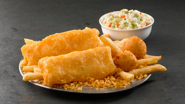 Long John Silver's is known for its seafood (it's named after an infamous pirate, after all). The only protein it offers besides fish and crustaceans is chicken. The meal comes with three pieces of fried all-white meat chicken strips, two sides, and two hushpuppies. Now, if you find yourself at the restaurant craving fried chicken, you might be tempted to choose this option. But if that's the case, you're much better off leaving and going someplace that doesn't specialize in seafood.