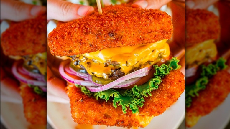 Are you ready for this list of ingredients? Have your heart doctor on speed dial just in case you aren't. In addition to the thick burger patty, there are mozzarella sticks, fried macaroni and cheese, onion rings, fries, bacon, American cheese, and golden barbecue sauce. The word "yowza" is a huge understatement. However, this is a burger that blasts you in the face with so much amazing rich flavor that you'll rethink your career choices — it has that much impact. Make this one of those once-in-a-lifetime burger experiences. Your arteries may not thank you, but your mouth will.