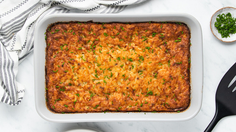 Potato kugel is a recipe that's long been associated with the Jewish holiday of Passover since, unlike noodle kugel, it does not contain any chametz, or forbidden ingredients (most noodles are made with durum wheat and are thus verboten during the Passover season). This potato kugel is something developer Catherine Brookes says it is "quite a classic recipe," and she describes it as having "a moreish flavor and texture." She also notes, "I love that it's all baked into one big batch and uses simple store cupboard ingredients." This kugel makes a great savory side for either a dairy or meat Passover entrée, even if you keep kosher year-round, as all of the ingredients are pareve.