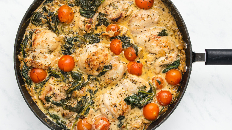 Brookes likes to make this dish with chicken thighs, explaining "I find they are the most tender cut of meat." If you don't care for dark meat, though, she does say that breasts or even wings can work. She also uses cherry tomatoes, saying "They add a sweetness to the dish as well as nice pops of bright red color," but you may feel free to use grape tomatoes, as well. Straight out of the pan, this chicken and vegetable dish makes a great low-carb meal, perhaps accompanied by a side salad. If you want some starch, though, it would go nicely with a side of rice pilaf.