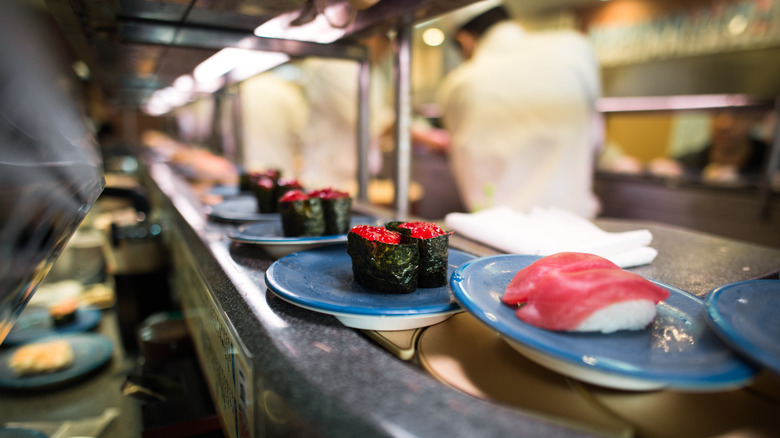 While American fast food can be wonderful to consume, there's something special about savoring the interactive enjoyment of a conveyor belt sushi restaurant. The dishes on these conveyor belts actually move right past you unless you grab them from the rotating sushi train or belt that they're served on. The first so-called kaiten-sushi restaurant opened in Japan in 1958. The Japanese restaurant owner who created the concept got the idea from beer bottles that were making the rounds on a conveyor belt at the Asahi factory.