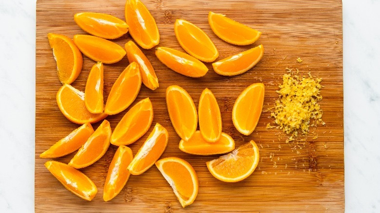 - Thoroughly clean the skin of the oranges and lemon. Slice the ends from the oranges and slice them into wedges. Zest the lemon.
