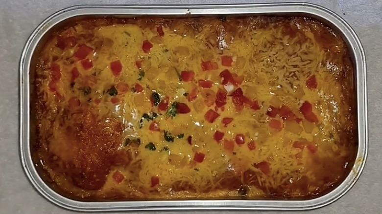 Enchiladas are the perfect comfort food: warm, flavorful, and cheesy. Not to mention, they're incredibly filling, especially when served with rice, beans, or vegetables. Costco makes having an enchilada dinner easier than ever with its chicken enchilada bake. Found in the prepared food or deli section of the warehouse club, the enchilada bake is made with Costco's signature rotisserie chicken, tortillas, enchilada sauce, beans, peppers, rice, and, of course, cheese. Think of the satisfying dish as a casserole made with enchilada ingredients.