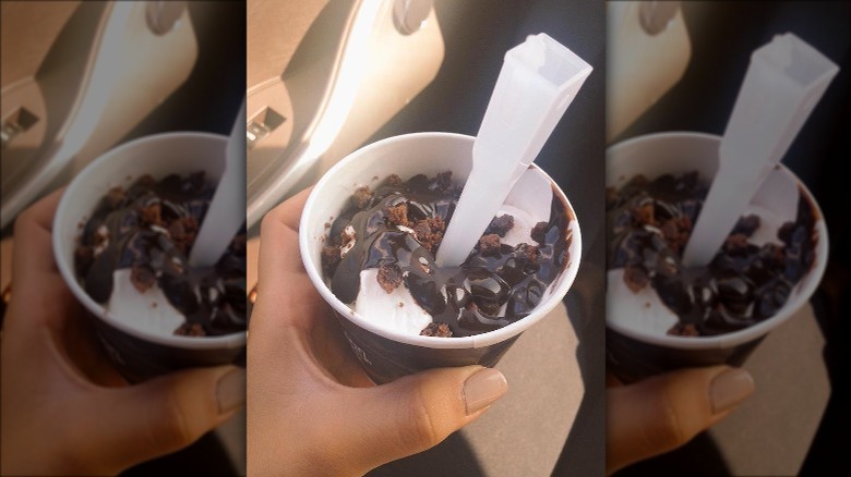 McDonald's has combined several different candies with soft serve ice cream to create incredible McFlurry flavors, including Rolo. For the uninitiated, a Rolo is a semi-cone-shaped piece of chocolate filled with slow-melting caramel in a bite-sized piece. McDonald's combined crushed pieces of Rolo chocolate with soft serve and a caramel drizzle to top it off. The gooeyness of the caramel-centered chocolates fit perfectly with the cold, refreshing vanilla. The last time the Rolo McFlurry was a regular fixture on the McMenu was in 2011. However, the fast food chain brought the fan-favorite back to the menu for a few months in 2017.