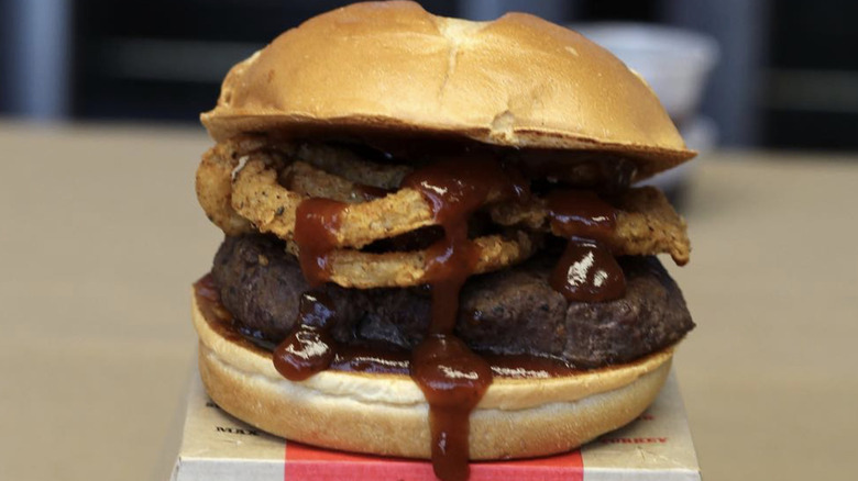 In May 2022, Arby's asserted its marketplace position as the most meat-centric fast food joint around by moving in on the competition's territory and unveiling its first ever hamburger. A relatively high-end item, Arby's spent two years nailing down the recipe and preparation for the Wagyu Deluxe Steakhouse Burger, according to Restaurant Business. Onto a large brioche bun went American cheese, shredded lettuce, pickle slices, red onions, tomatoes, and a newly concocted and proprietary hamburger sauce. All that bolstered the main ingredient, a 6.4-ounce (before frying) patty made up of just over 50% premium and intricately marbled American Wagyu beef.