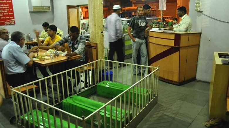 Any connoisseur of horror films will tell you that building a house or business on a burial ground is a bad idea. The owner of the New Lucky Restaurant in Ahmedabad, India seems to have avoided any bad juju, because his restaurant has been going strong for 60 years. Owner Krishnan Kutti could have merely paved over the graves where his restaurant was to go, but rather than disturb the dead, he built his eatery around the burial sites. Patrons enjoy their meals in booths that sit right beside graves with only steel bars between them.