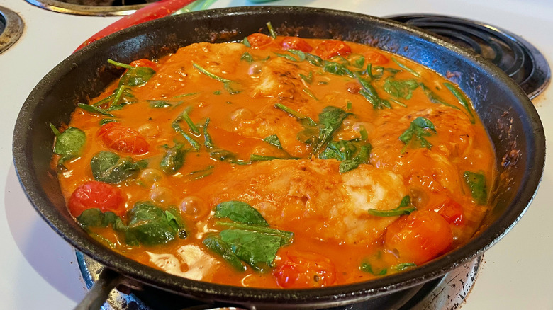 Based on an average-sized chicken breast, one serving (which equals one breast plus a quarter-pound of pasta and one-fourth of the sauce) equals approximately 776 calories, 17.2 grams of fat (4.8 of which are saturated), 764 milligrams of sodium, 96.7 grams of carbs, 5.7 grams of fiber, and 60.4 grams of protein. You also get 20% of the daily recommended value of vitamin D and 39% of your daily iron. If you're following a particularly low-carb or low-salt diet, this isn't the meal for you, but it's overall fairly nutritionally balanced. It is rather high in cholesterol, but according to the Harvard T.H. Chan School of Public Health, for most people, dietary cholesterol consumption doesn't affect blood cholesterol levels very much.
