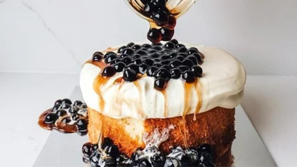 The most satisfying part of the boba cake baking process is the final step, which involves wrapping the top of the cooled sponge in an acetate cake collar, pouring the lava-like pastry cream and tapioca pearls on top, and removing it to let gravity do its thing. The pillowy, thick layer falls down the cake perfectly due to the airy whipped cream added into the mix, and we think this would definitely make for an eye-catching technical challenge on The Great British Baking Show.