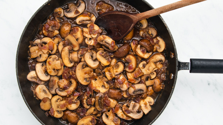- Add the mushrooms and fry for about 5 minutes, until they soften and start to brown.