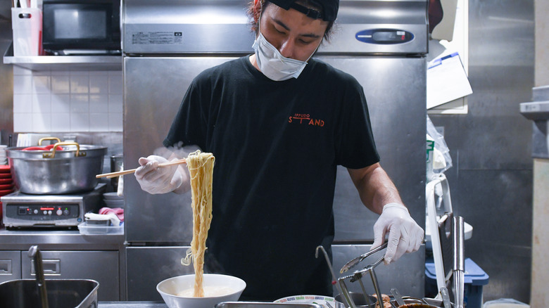 Tonkotsu ramen isn't something you can just throw together in an hour. It's a long labor of love that can take more than a day to perfect. The heart of tonkotsu ramen is right there in the name — it starts with pork bones to create that deep, rich broth. The bones are boiled for hours, sometimes up to 60 hours, in order to break down all of the fat and marrow and to create that gelatin-like consistency. Other vegetables can be added to the broth, like onions, scallions, and mushrooms. The best ramen shops might even add extra pork fat into the boiling pot to get an incomparable richness to the broth.