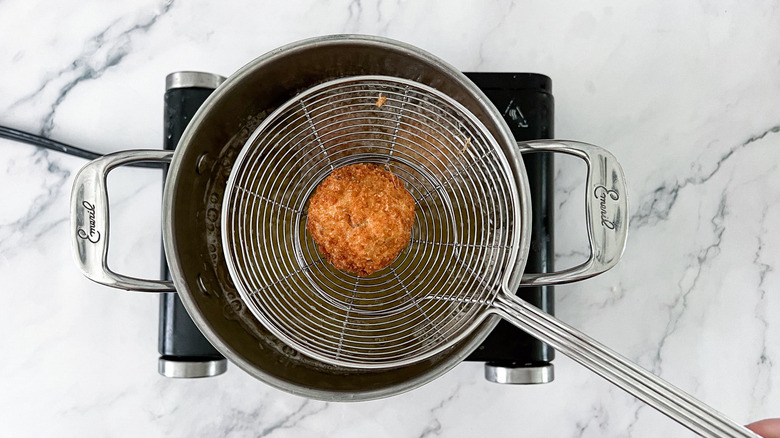 Depending on the size of your pot, you will likely need to work in batches. It's best not to overcrowd the pot when it comes to frying, so take your time and fry just a couple of balls at once for the best results. Also, keep an eye on the oil's temperature and make sure it stays around 360 F for the entirety of the frying period.